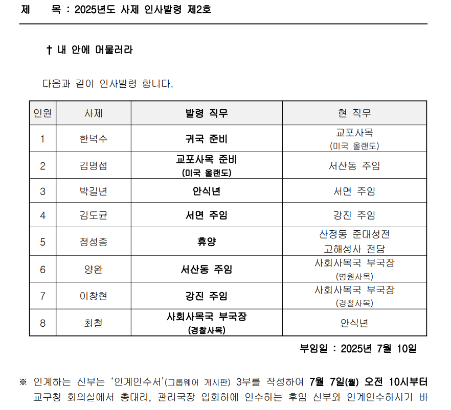 | 2025 하반기 광주대교구 사제인사발령 확정 공유합니다. (0) | 2025.07.02 |