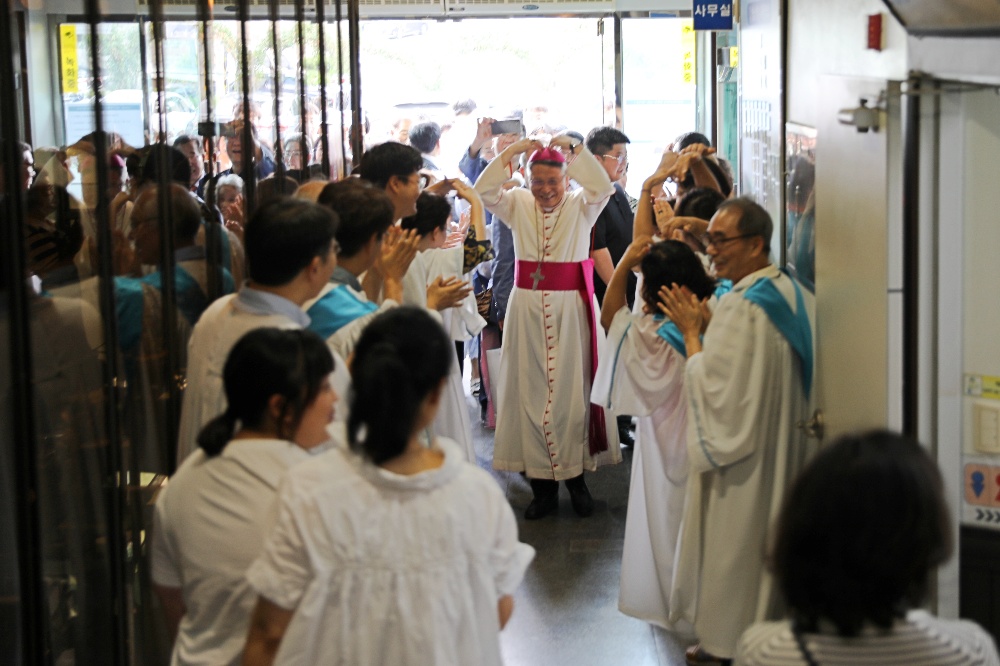 수원교구 리노주교님 사목방문 기록 일기 환영인사 / 성가 / 질문 / 강론 / 식사 무더운 여름 주일에 주교님이 우리 성당에 오신다. 전신자 한 달 전부터 304번(대사제) 전신자 연습을 했다.