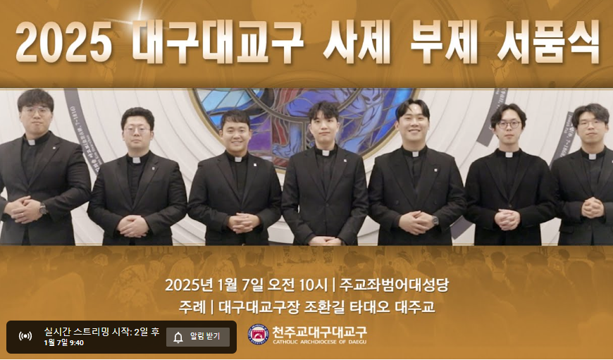 대구대교구의 사제 부제 <서품식>은 1월에 진행됩니다. 아래에서 생방송을 간편하게 시청하시기 바랍니다. 사제 부제서품을 진심으로 축하드립니다. 각 본당 신자분들도 축하드립니다. 🎉🎉🎉🎉🎉