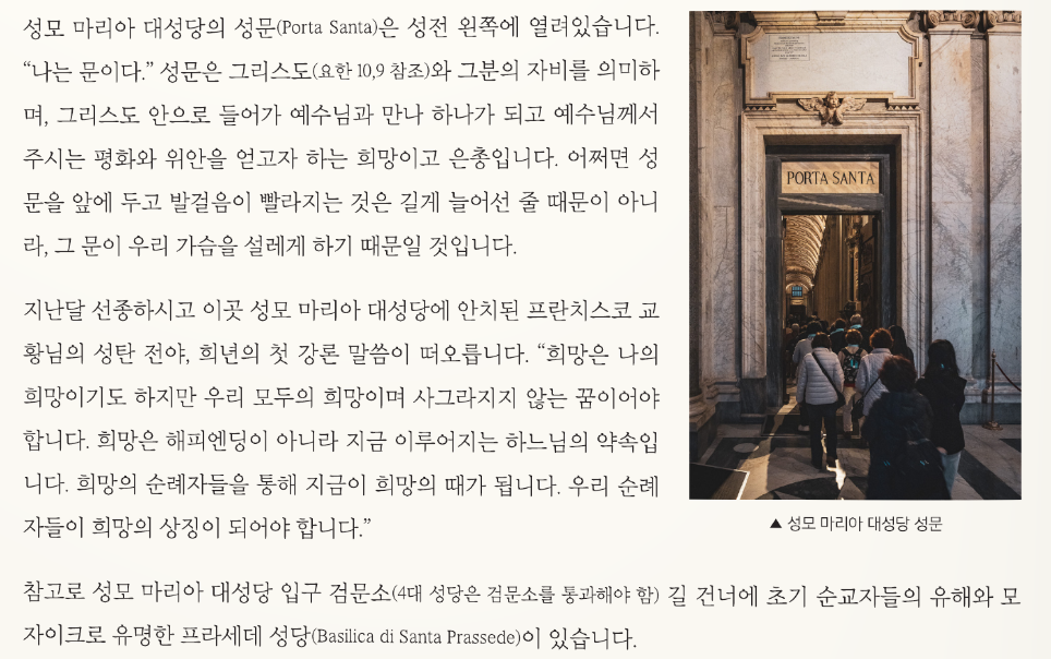 성전 왼쪽에 자리한 성문(Porta Santa)은 요한복음 10장 9절에 나오는 “나는 문이다”라는 말씀처럼, 그리스도를 향한 자비와 은총의 문입니다.