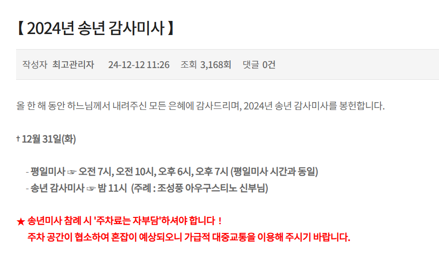 <2024년> 성탄밤미사와 대축일낮미사를 마치고 <송년미사> 관련 글을 씁니다. 2024년 12월 31일 명동성당, 송년감사미사 일정 공유합니다.  마지막 날 송년미사 일정은 평소 명동성당 평일미사와 동일하며, 송년감사미사는 저녁 늦게 시작합니다. 아래에서 자세한 일정 확인하시고 참석하시길 바랍니다. 메리크리스마스🩷