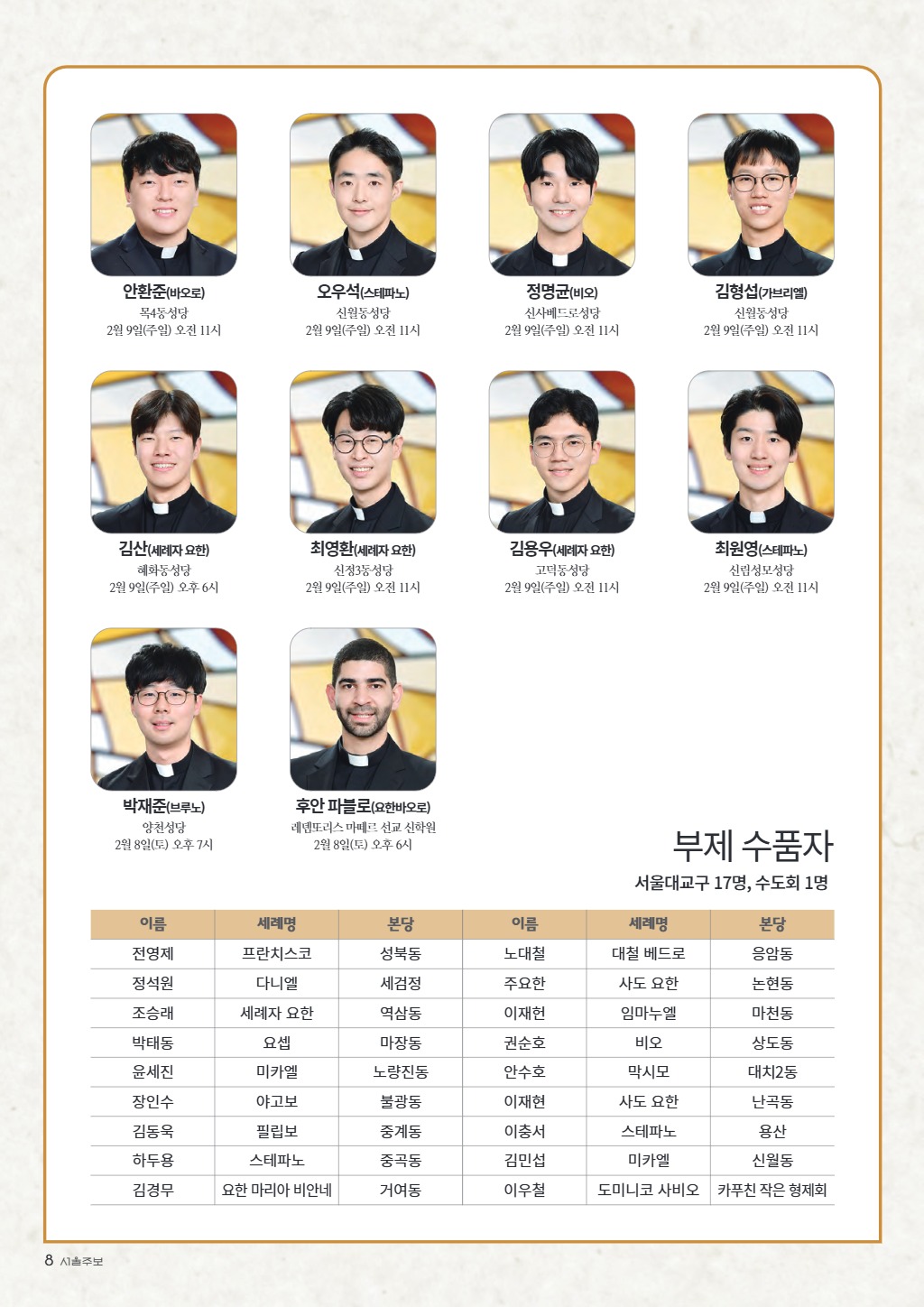 어제 서울대교구 사제서품식이 있었습니다. 2025년 서울대교구 사제서품식으로 서울대교구는 사제 천명의 시대를 맞이했습니다. 아래에서 새신부들의 정보와 첫 미사 일정 확인하세요.