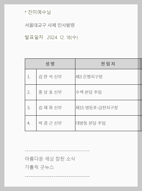 24년 12월 18일 서울대교구 사제인사발령 공유합니다. 4명의 사제의 변동이 있으며, 아마 1월 중 사제서품 후 정기인사발령이 있을 듯합니다. 상반기 정기인사발령이 업데이트되면 다시 공유하겠습니다.