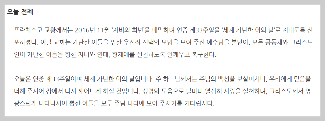 ✅ 세계 가난한 이의 날은 이제 모든 교회 공동체의 정규 거행일이 되었습니다. 세계 가난한 이의 날은 가난한 이들의 기도에 귀 기울이고 그들의 현존과 필요를 인식하라는 도전 과제를 모든 신자에게 내어놓는, 그래서 결코 소홀히 여겨서는 안 되는 사목적 기회입니다.