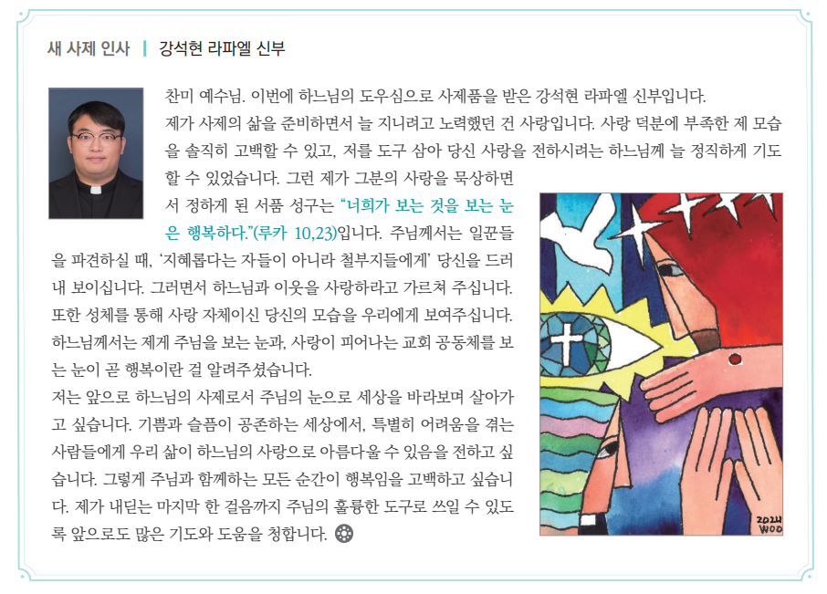 이번주 의정부교구의 새사제 서품 및 사제인사발령이 있었습니다. 그리고 새사제 서품소감문이 공개되었습니다.