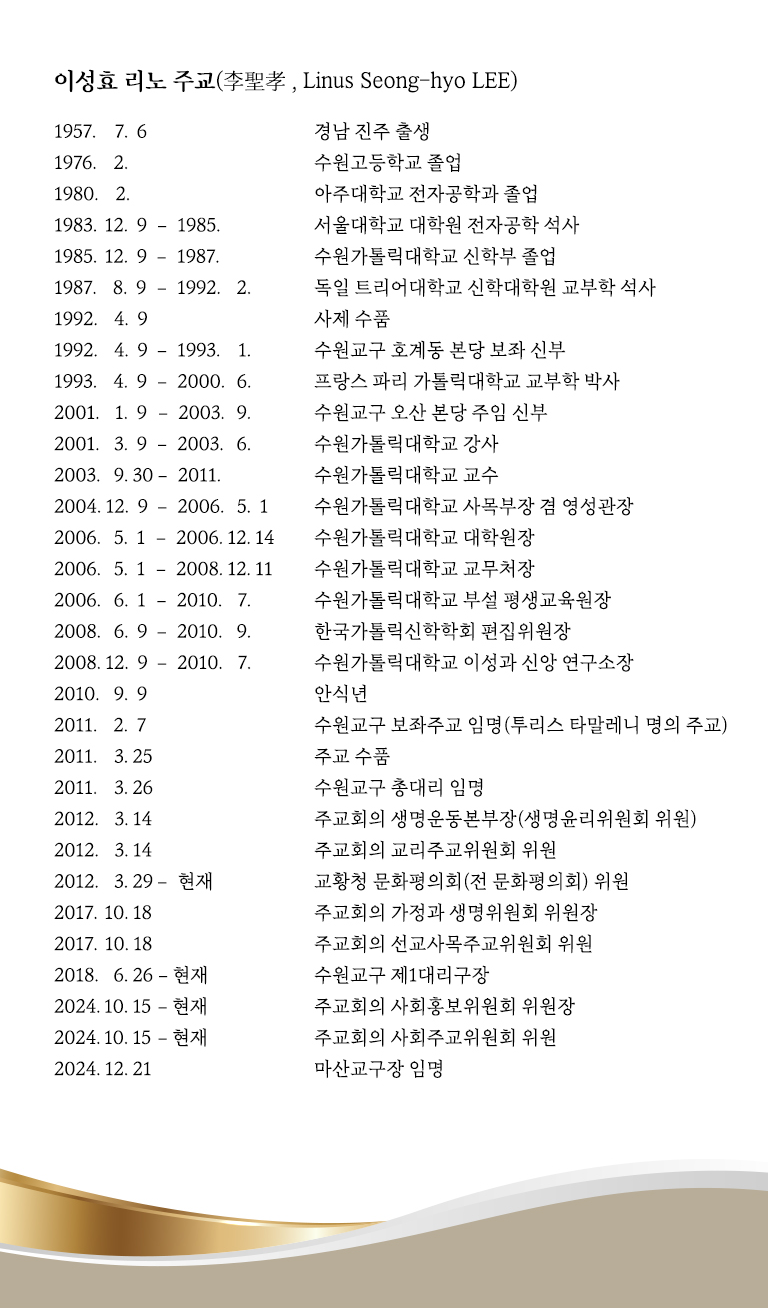 이성효 주교는 사제 서품 후 33년 동안, 그중 13년 7개월을 수원교구 총 대리 주교 직분을 수행하셨다. 수원교구민과 우리 사제단은 그동안 헌신하신 주교님의 노고와 수고에 깊은 감사를 드리면서 지난 일을 오래 간직할 것이라고 말했다.