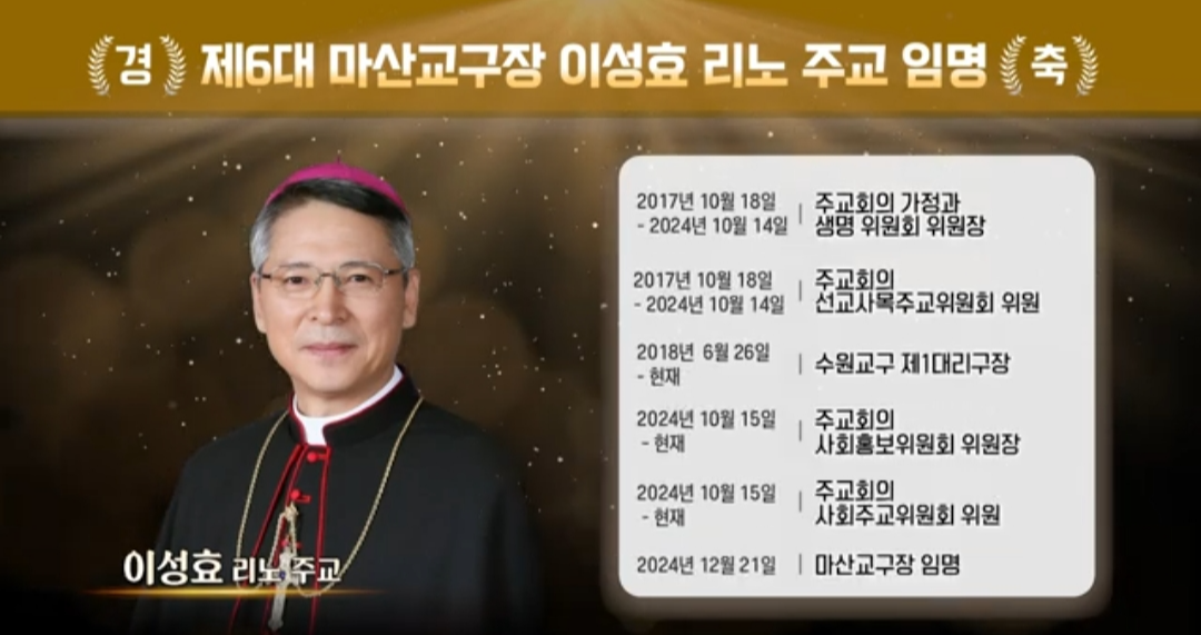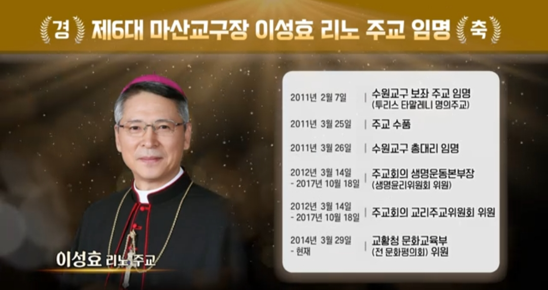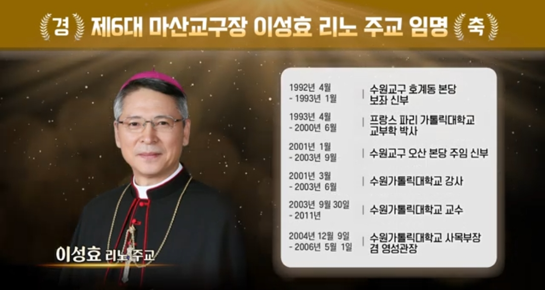 오늘은 수원교구 이성효 리노 주교의 마산교구 제6대 마산교구 교구장으로 임명된 정보를 공유하겠습니다.