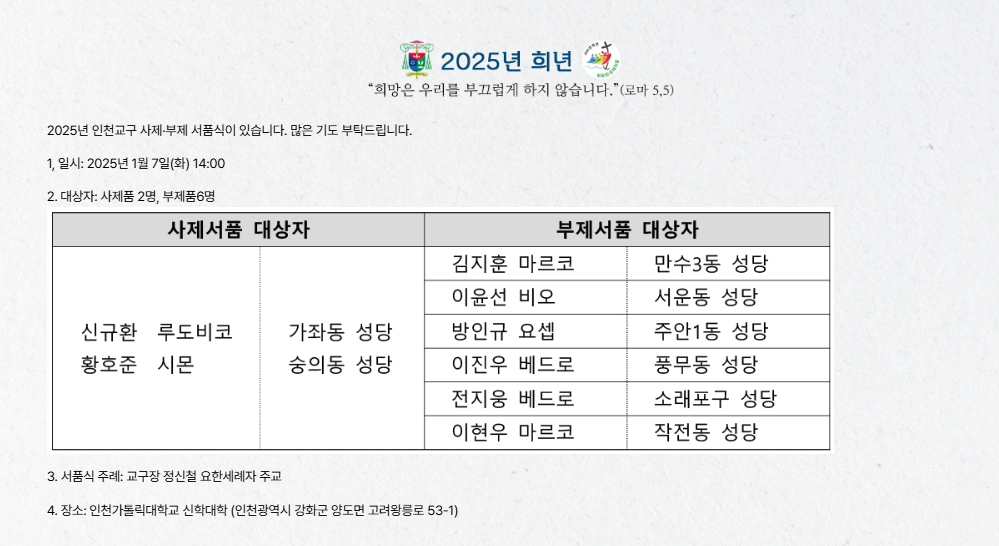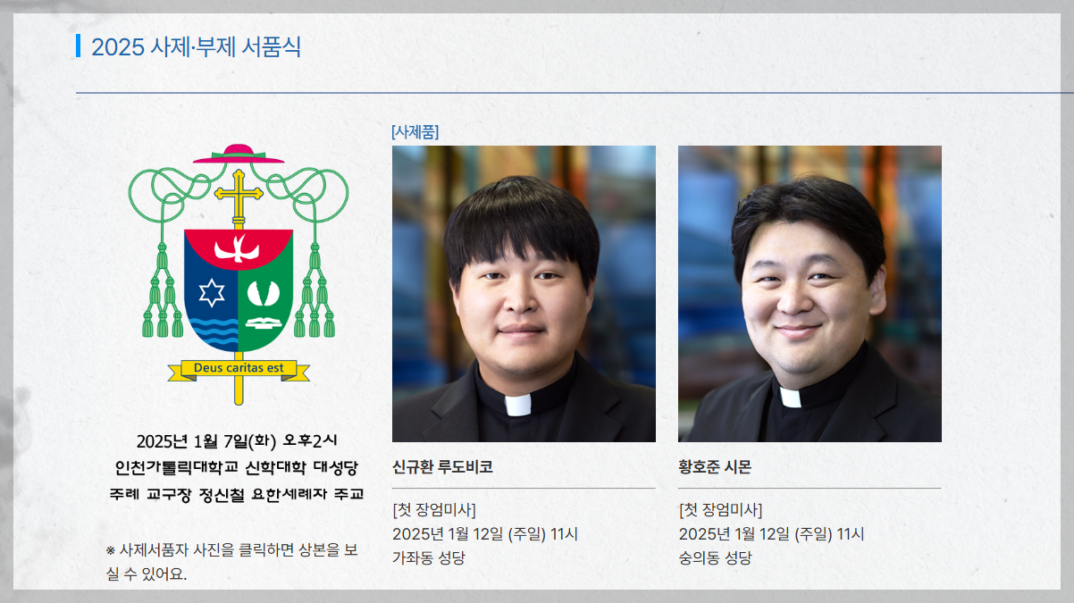 오늘은 천주교 인천교구의 사제 및 부제 서품식 정보에 대해 공유하겠습니다. 사제와 부제 각 본당 신자분들 축하드립니다. 🎉