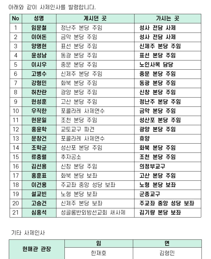 사제 인사를 발령합니다. 아래에서 가시는 곳과 부임일 확인가능합니다.