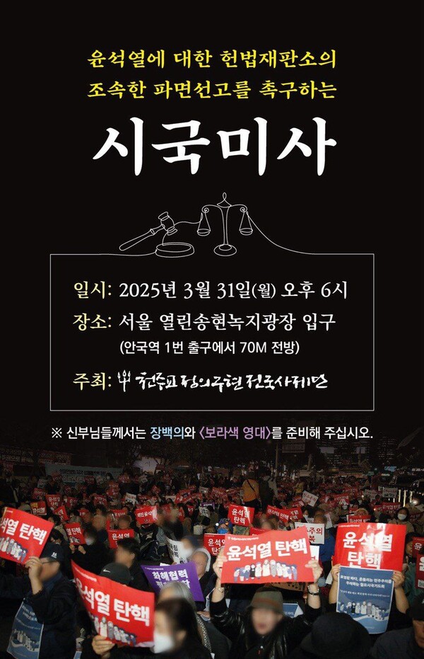 여덟 명 재판관에게 묻겠습니다. 군경을 동원해서 국회와 선관위를 봉쇄 장악하고 정치인과 법관들을 체포하려 했던 위헌·위법행위를 단죄하는 것이, 명백한 사실도 부인하고 모든 책임을 아랫사람에게 돌리는 자의 헌법수호 의지를 가늠하는 것이, 그를 어떻게 해야 국익에 부합하는지 식별하는 것이 그렇게 어려운 일입니까? 가타부타 아무 말도 못 하고 있는 재판관들에게 성경의 단순한 원칙을 전합니다. "너희는 말할 때 '예' 할 것은 '예'하고, '아니요' 할 것은 '아니요'라고만 하여라. 그 이상의 것은 악에서 나오는 것이다."(마태 5,37)