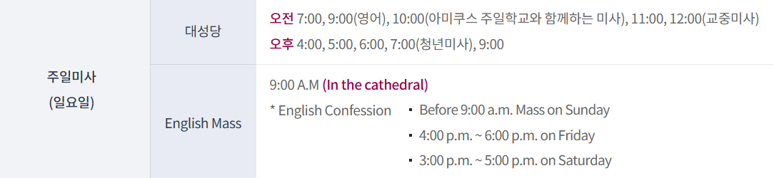 요일별로 정리하겠습니다. 원하시는 요일 확인하시고 미사참석하시기 바랍니다. 모든미사는 <대성당>에서 봉헌합니다.